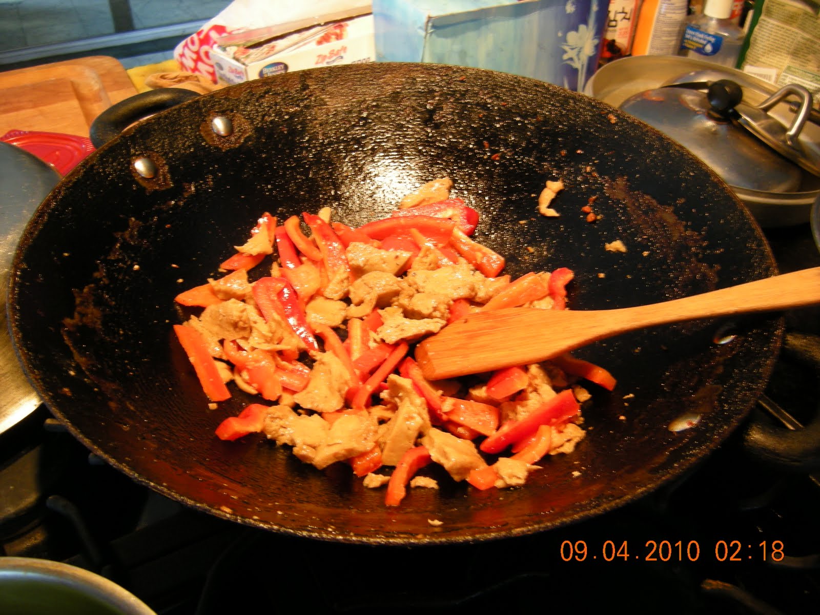 Westsoy seitan strips and red bell peppers.