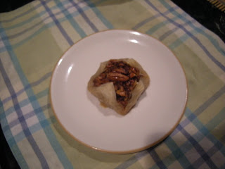 The next kitchen creation is Apple Strudel, also from TJOVB. This may seem like a labor-intensive process, but it was actually quite do-able and the baking time was a mere 20 minutes. The most annoying thing was brushing the butter on each layer of phyllo (the phyllo itself is a bit tricky to separate) , since you do have to take care not to rip the sheet, though it does get easier with each successive stroke. I substituted the lemon juice with orange which was an acceptable swap (of course lemon juice would probably have been better), since it was a citrus, after all. Be careful when transferring the strudel from the assembly area to the baking sheet, since contents may fall out.